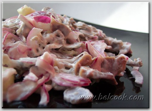 Еще один салатик с маринованным луком, на этот раз компанию ему составляют куриные желудки.