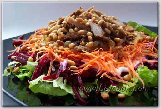 Наверняка вы встречали салаты в которых продукты режут соломкой, укладывают разноцветными горками и перед подачей перемешивают. Составляющие в них могут быть самыми разнообразными, самые популярные, пожалуй, свекла, морковь, мясо да жареная картошка. Этот салат родился как раз по мотивам таких вот «горок». Основой его стала маринованная свекла.