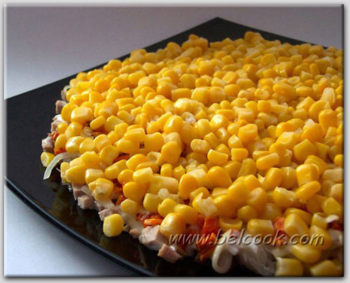Название этого салата абсолютно не соответствует его сути. Ну нет ничего восточного в салате с майонезом, мясом, маринованым луком да жареной морковкой. Но все ж напишу его с тем названием под которым он прижился у нас в доме. Отварное мясо, кисло-сладкий лук, обжаренная морковь и сладкая кукуруза просто отлично сочетаются вместе. Попробуйте.