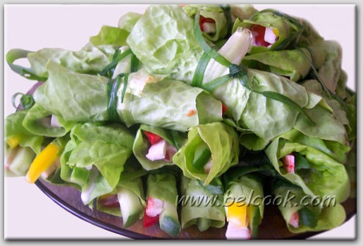 Удивительно приятный салат-закуска, который полностью оправдывает свое название :) В оригинале он просто выкладывается на листья салата, но рулетиками мне он больше нравится. Очень удобная закуска для вылазок на природу и для празднования дней рождений и прочих праздников на работе :)
