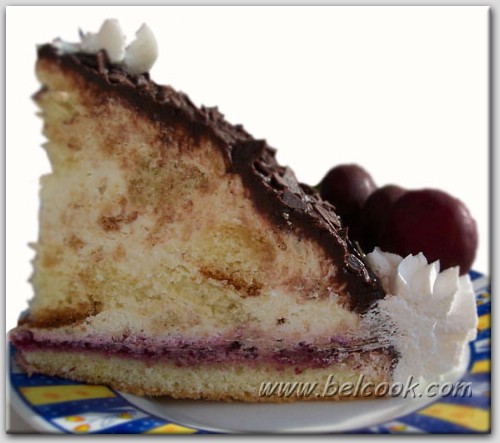 У меня на фото торт украшен взбитыми сливками, черешней и шоколадной крошкой.