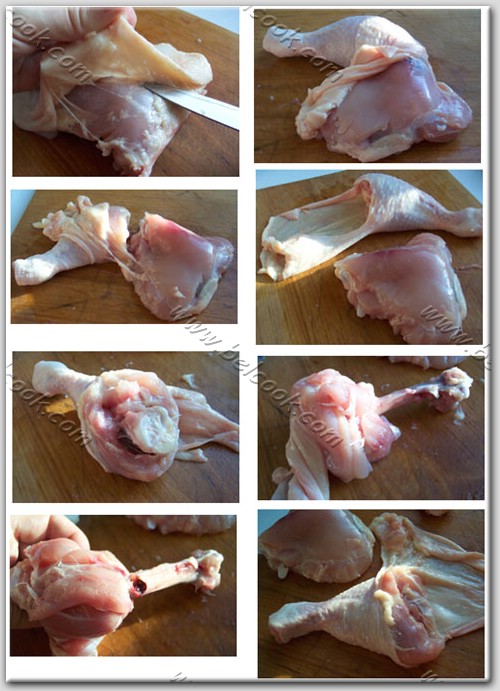 Отделяем осторожно ножом кожу от мяса на бедрышке (снимаем чулком до середины окорочка). Разрезаем ножку по суставу на две части: голень (с кожей) и бедрышко (без кожи). Бедрышки для этого рецепта нам не понадобятся (можно их оставить для салата или супчика), а из голени лучше удалить кость (будет больше полость для начинки).
