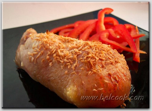 Смешиваем лук с картошкой, солим, перемешиваем и наполняем получившейся начинкой окорочка (наполняется полость в голени и верхний кармашек из кожи, т.е. место косточки и бедрышка займет картофельная масса). Осторожно заворачиваем кожу (можно скрепить зубочисткой для уверенности), слегка смазываем майонезом и посыпаем кокосовыми хлопьями. Укладываем в форму слегка смазанную растительным маслом и отправляем на 20 минут в духовку разогретую до 200 гр. цельсия.