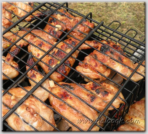 Кусочки курицы (у меня крылья) солим, посыпаем красным молотым перцем. Луковицу меленько режем и добавляем к курице. Заливаем мясо маринадом, перемешиваем и ставим на ночь в холодильник. Выкладываем на решетку и жарим на углях.