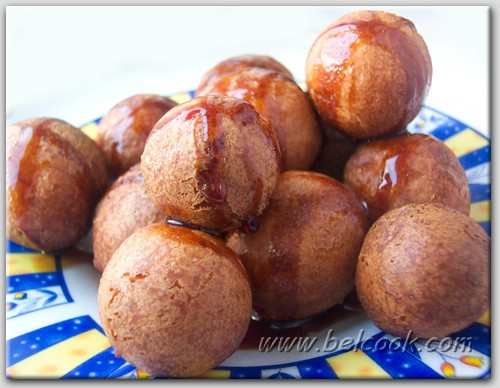 Взбиваем яйца со сгущеным молоком, добавляем муку, перемешиваем, добавляем гашенную соду. Перемешиваем и добавляем еще муку, столько сколько понадобиться что б получилось не очень крутое тесто. Тесто получается липкое. По рецепту предлагалось скатать из него колбаску, разрезать ее на небольшие кусочки и жарить. Но колбаску из него сделать у меня не вышло ни разу, так как тесто липнет к рукам и столу, а потому легче мокрыми руками открывать кусочек теста, скатывать шарик и бросать его в хорошо разогретое масло.