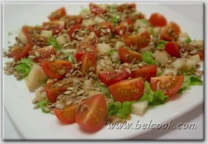 Выкладываем на блюдо листья салата, помидорки, кусочки груши, посыпаем семечками и поливаем заправкой.