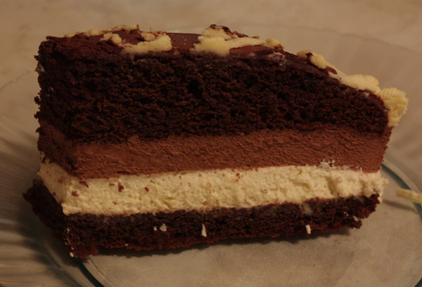 1. Бисквит разрезаем пополам. Кольцо разъемной формы выстилаем бумагой для выпечки (это не даст нашему суфле убежать). Укладываем в кольцо первый бисквит. Выливаем сверху белое суфле. Разравниваем и убираем в холодильник примерно на час. Как только суфле застынет, выливаем на него темное суфле и накрываем вторым коржом. Снова отправляем в холодильник (лучше на ночь). Затем снимаем кольцо разъемной формы, убираем бумагу и оформляем торт по своему вкусу (покрываем шоколадной глазурью, растопленным шоколадом или сливками)