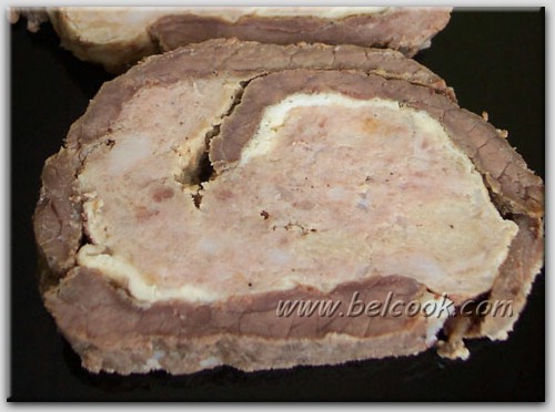 Рулет очень вкусный, особенно с хреном хорош :) Но в процессе приготовления мной было допущено несколько ошибок, которые в следующий раз учту и исправлю. Во-первых, я делала рулет не из одного пласта мяса, а из нескольких кусочков, а потому готовый рулет при нарезке кое-где разваливался. Во-вторых, омлета в готовом рулете оказалось маловато, а потому в следующий раз увеличу количество яиц для омлета (можно сделать омлет с молоком и мукой, будет только лучше). В-третьих, я делала рулет поздно и дабы не нарушать мирный сон домашних и соседей практически не отбила мясо, что тоже привело к тому что рулет недостаточно хорошо свернулся, получались пустоты между мясом и фаршем, кусочки мяса недостаточно плотно прилегли друг к другу и рулет, как я уже говорила, разваливался.