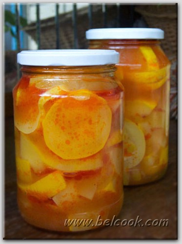 Очень вкусная заготовка из молодых кабачков. Кабачки пропитываются соусом и не смотря на варку остаются хрустящими. Очень советую приготовить в сезон.