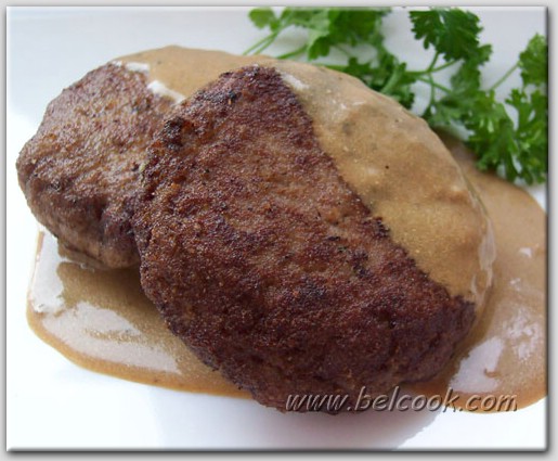 Представить белорусскую кухню без грибов, пожалуй, так же сложно как и без картошки. С грибами варят супы и щи с кислой капусты, тушат с ними капусту, картошку, варят всевозможные похлебки, жарят с ними драники и фаршируют яйца, готовят с ними мачанки и паливки, даже грибной порошок делают (растирают сушеные грибы и приправляют ими все блюда). Этот рецепт яркое доказательство любви белорусов к грибам. Говяжий биточек, нафаршированный ароматными грибами, под грибным соусом — настоящий праздник для любителей грибов.