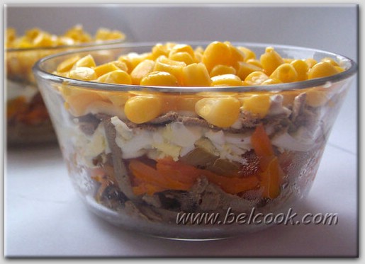 Вкусный, сытный салат для любителей печени. В оригинале вместо кукурузы используется зеленый горошек, но с кукурузой мне этот салат нравится больше.